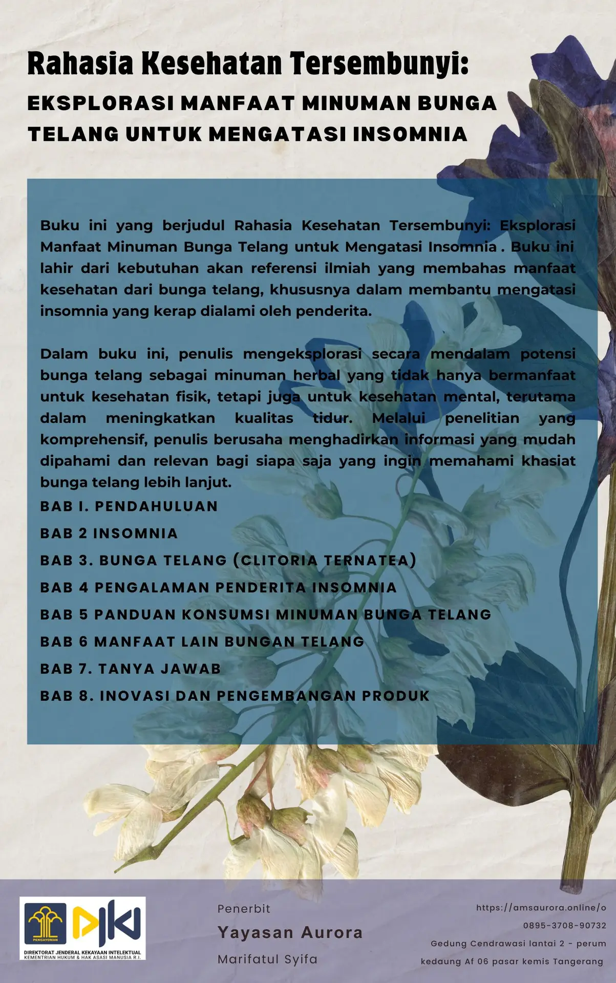 buku ini yang berjudul Rahasia Kesehatan Tersembunyi: Eksplorasi Manfaat Minuman Bunga Telang untuk Mengatasi Insomnia . Buku ini lahir dari kebutuhan akan referensi ilmiah yang membahas manfaat kesehatan dari bunga telang, khususnya dalam membantu mengatasi insomnia yang kerap dialami oleh penderita.